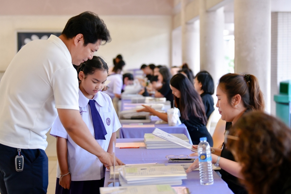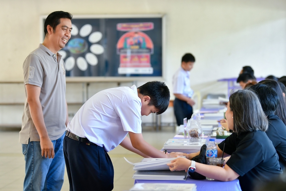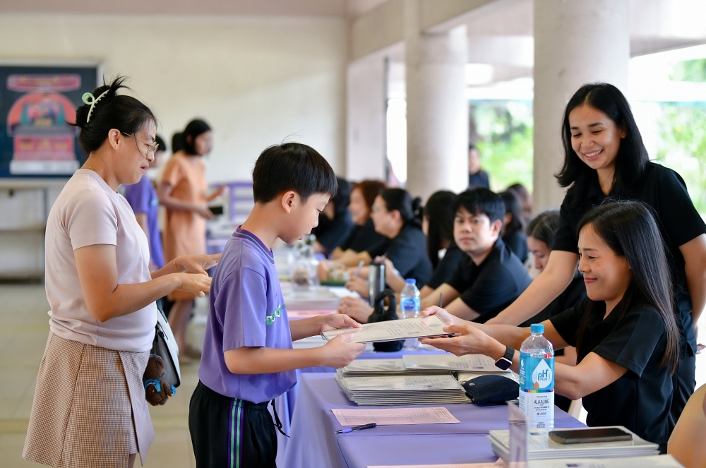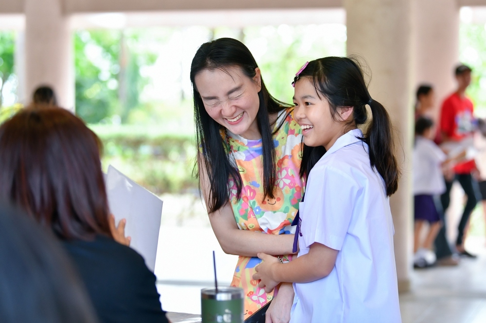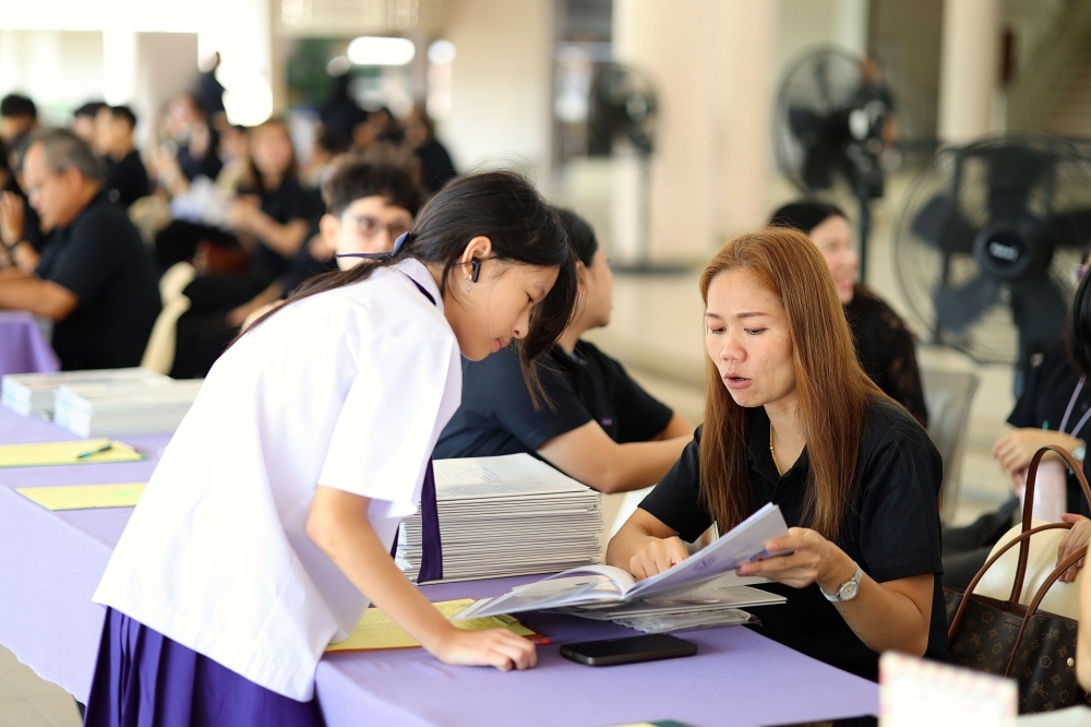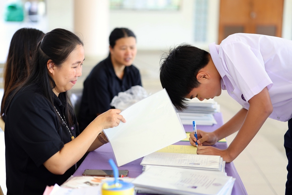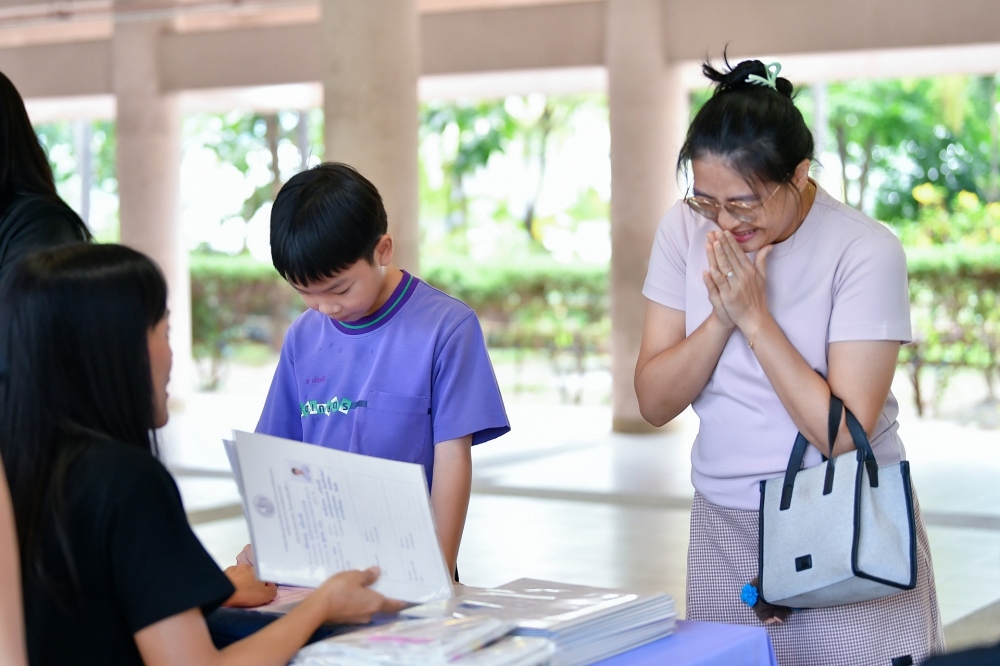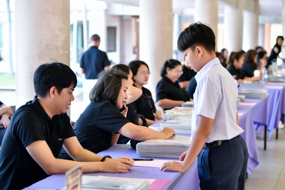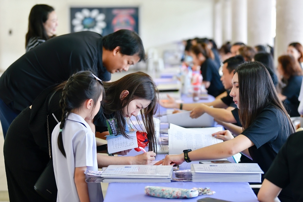 บรรยากาศการรับแบบรายงานผลการเรียน ของนักเรียนระดับชั้น ป.1 - ม.6 ปีการศึกษา 2568 ในวันศุกร์ที่ 27 มีนาคม 2569 เวลา 08.30 - 11.00 น. ณ บริเวณใต้อาคาร 3