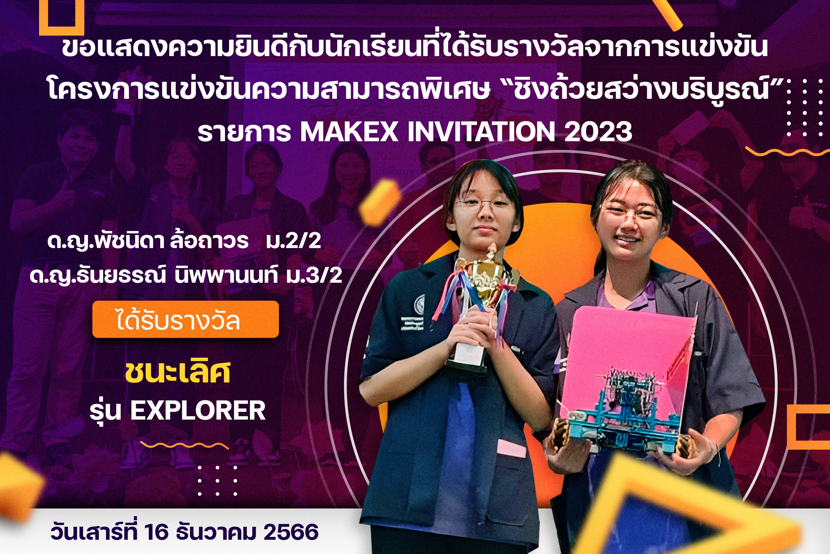 ขอแสดงความยินดีกับนักเรียนที่ได้รับรางวัลจากการแข่งขันโครงการแข่งขันความสามารถพิเศษ “ชิงถ้วยสว่างบริบูรณ์” รายการ MakeX Invitation 2023
