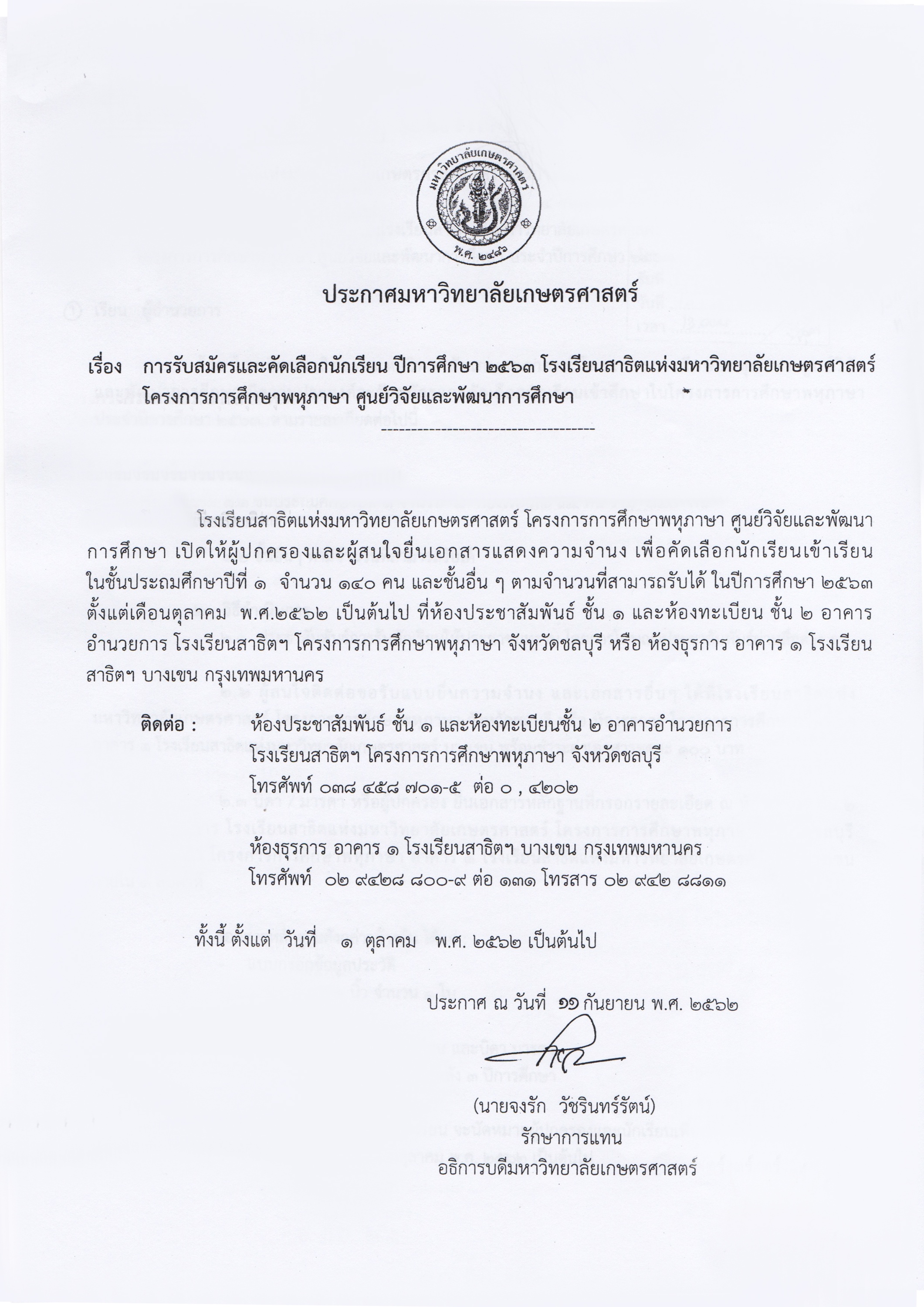 โรงเรียนสาธิตแห่งมหาวิทยาลัยเกษตรศาสตร์ โครงการการศึกษาพหุภาษา ศูนย์วิจัยและพัฒนาการศึกษา จังหวัดชลบุรี เปิดให้ผู้ปกครองและผู้สนใจยื่นเอกสารแสดงความจำนง เพื่อคัดเลือกนักเรียนเข้าเขียนในชั้นประถมศึกษาปีที่ 1 จำนวน 140 คน และชั้นอื่น ๆ ตามจำนวนที่รับได้ ในปีการศึกษา 2563 ตั้งแต่เดือนตุลาคม 2562 เป็นต้นไป ที่ห้องประชาสัมพันธ์ ชั้น 1 และห้องทะเบียน ชั้น 2 อาคารอำนวยการ โรงเรียนสาธิตแห่งมหาวิทยาลัยเกษตรศาสตร์ โครงการการศึกษาพหุภาษา จังหวัดชลบุรี หรือห้องธุรการ อาคาร 1 โรงเรียนสาธิตแห่งมหาวิทยาลัยเกษตรศาสตร์ บางเขน กรุงเทพมหานคร