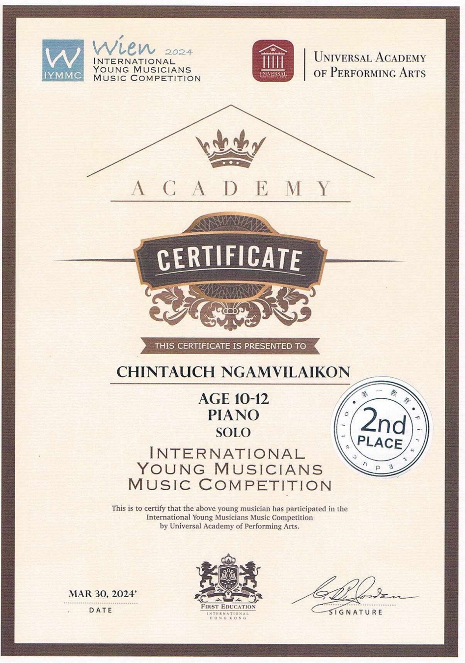 ขอแสดงความยินดีกับนักเรียนที่ได้รับรางวัลจากการแข่งขันเปียโนระดับชาติ ในรายการ International Young Musicians Music Competition : THAILAND 2024