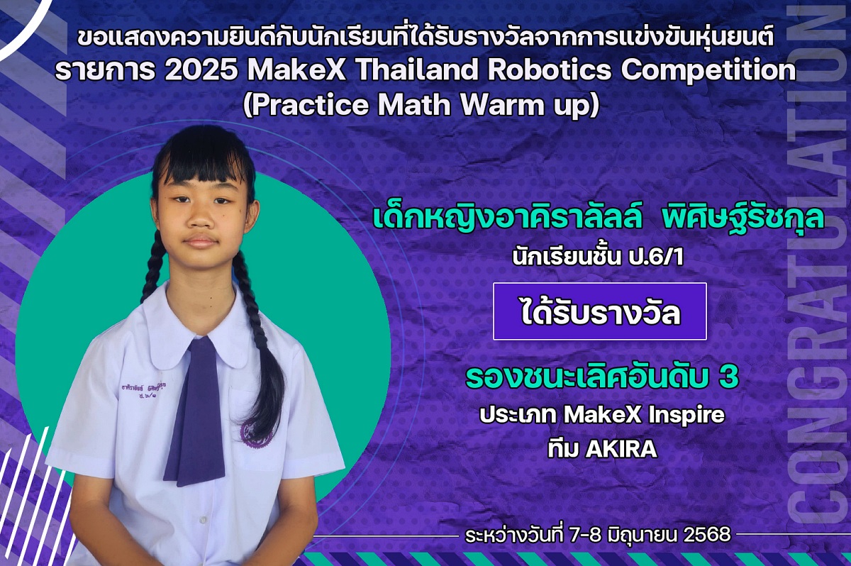 ขอแสดงความยินดีกับนักเรียนที่ได้รับรางวัลจากการแข่งขัน 2025 MakeX Thailand Robotics Competition (Practice Math Warm up)