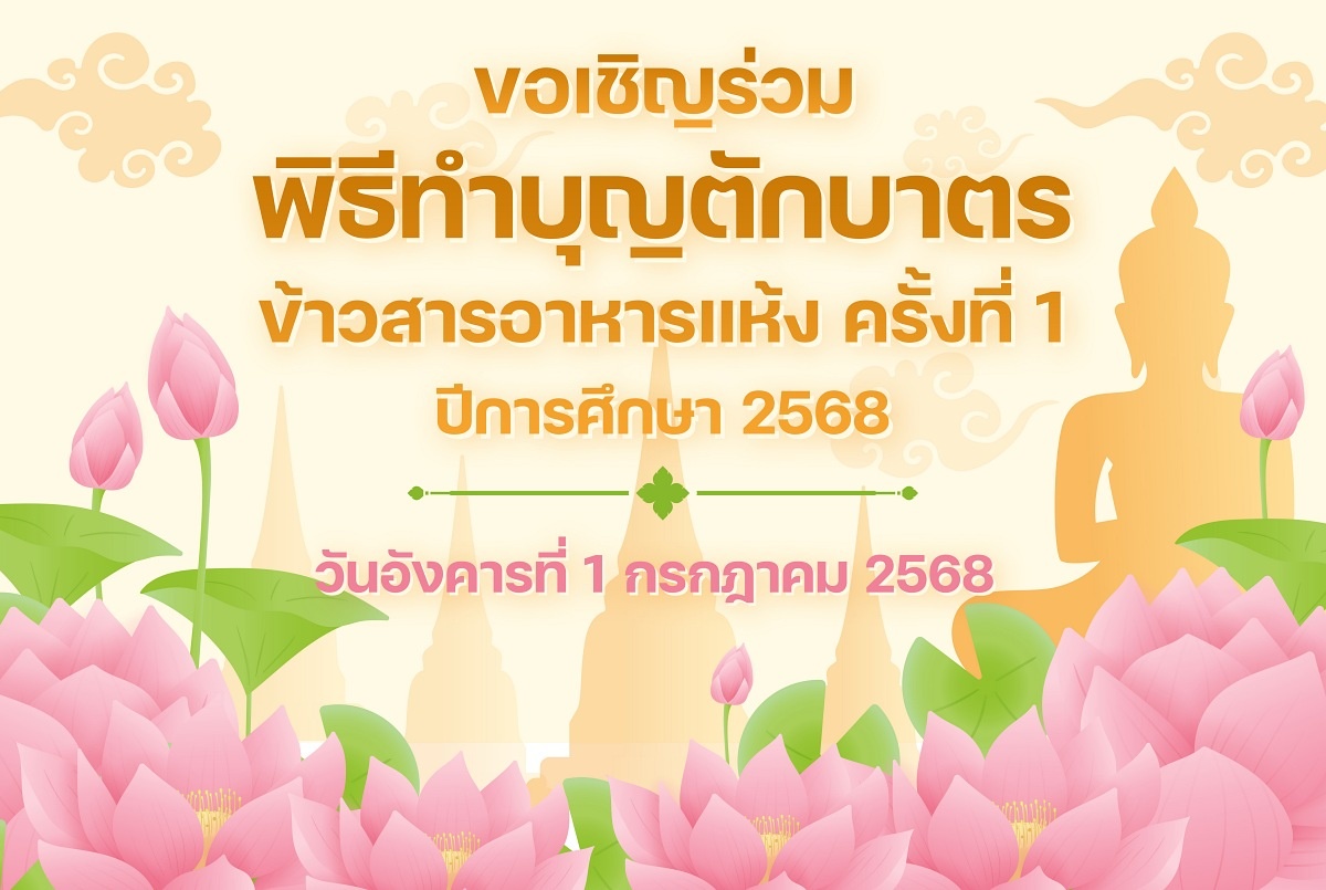 ขอเชิญร่วมทำบุญตักบาตรข้าวสารอาหารแห้งครั้งที่ 1 ปีการศึกษา 2568 ในวันอังคารที่ 1 กรกฎาคม 2568 เวลา 07.30 - 08.00 น. บริเวณชั้น 1 อาคารอำนวยการ