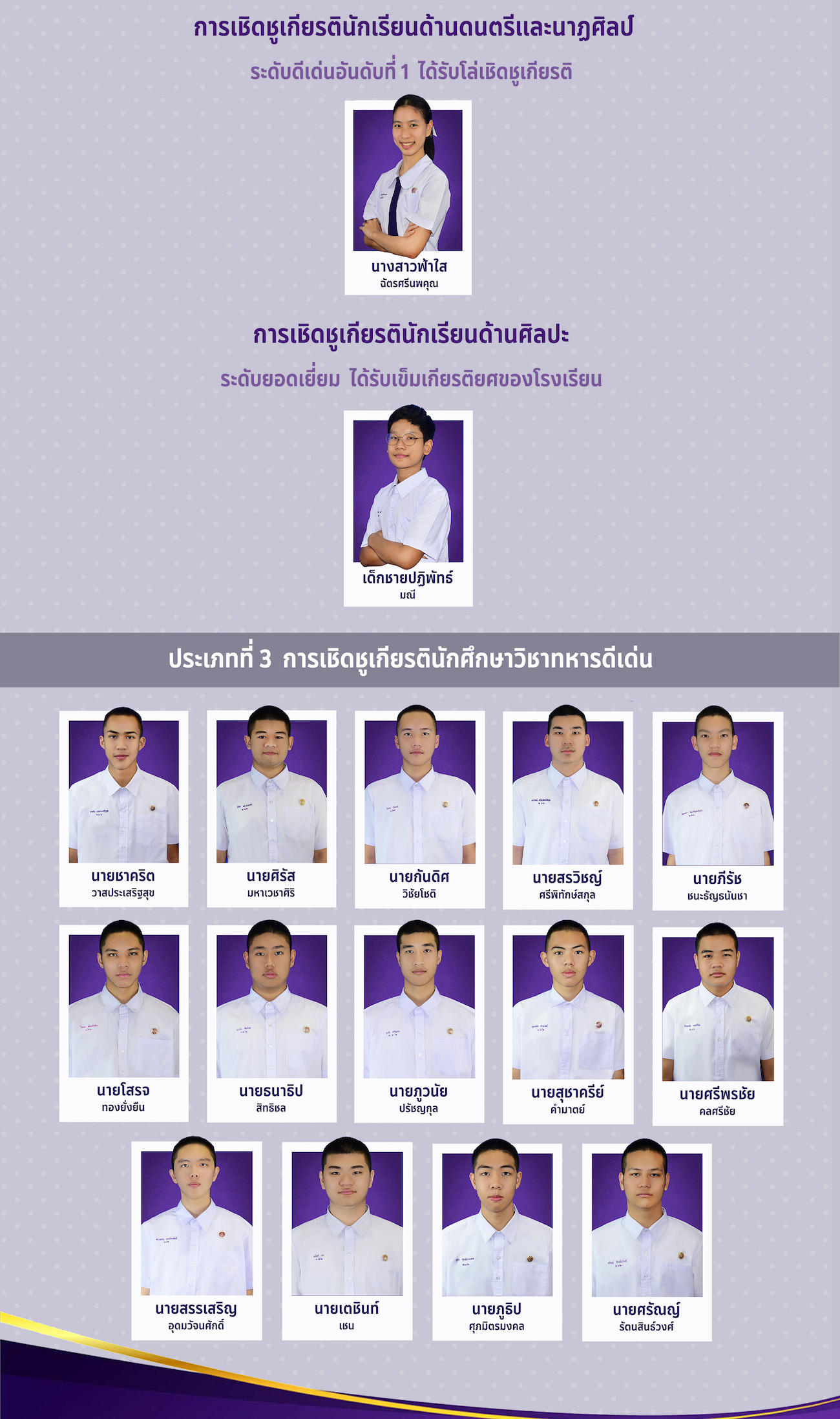 มติที่ประชุมคณะกรรมการดำเนินงานโครงการการศึกษาพหุภาษา ครั้งที่ 1/2563 เมื่อวันที่ 4 มิถุนายน พ.ศ.2563 เห็นสมควรยกย่องนักเรียนที่ได้แสดงความสามารถพิเศษด้านใดด้านหนึ่ง เพื่อประโยชน์ของส่วนรวมทั้งแก่โรงเรียนสม่ำเสมอเป็นระยะเวลานานติดต่อกันหลายปี และเป็นผู้ซึ่งมีความประพฤติดีงาม ความพยายาม อดทน มีวินัยในตนเอง รู้จักใช้เวลาว่างให้เกิดประโยชน์ มีน้ำใจ เสียสละ ทำงานและสร้างสรรค์กิจกรรมให้แก่ส่วนรวมอย่างสม่ำเสมอ สมควรเป็นแบบอย่างให้กับบุคคลทั่วไป จำนวน 32 ราย ดังต่อไปนี้